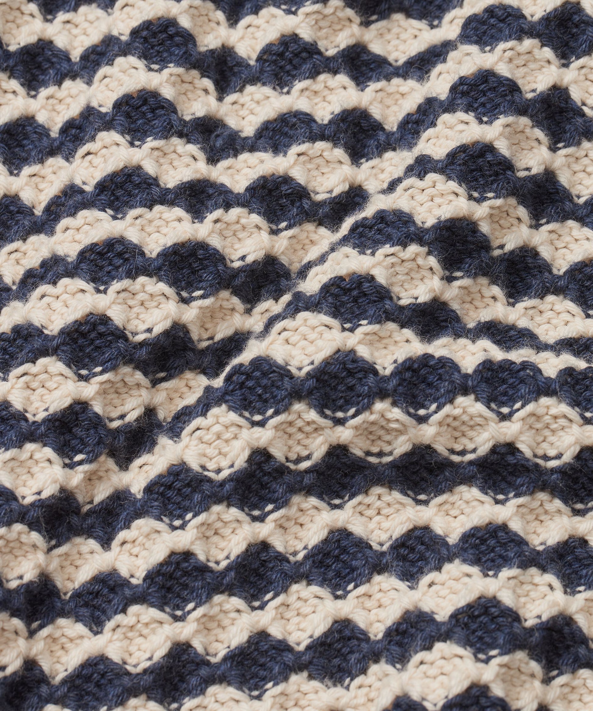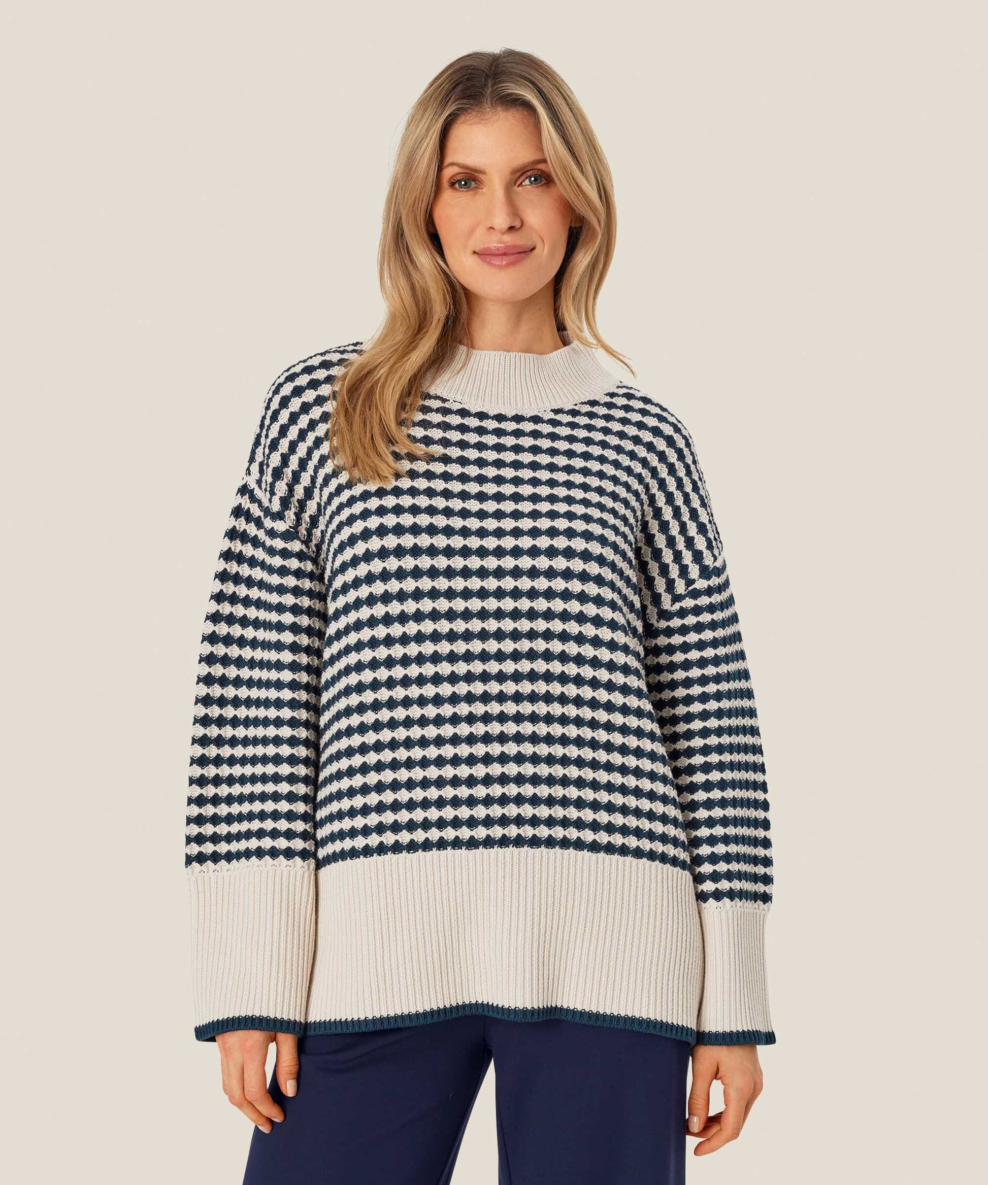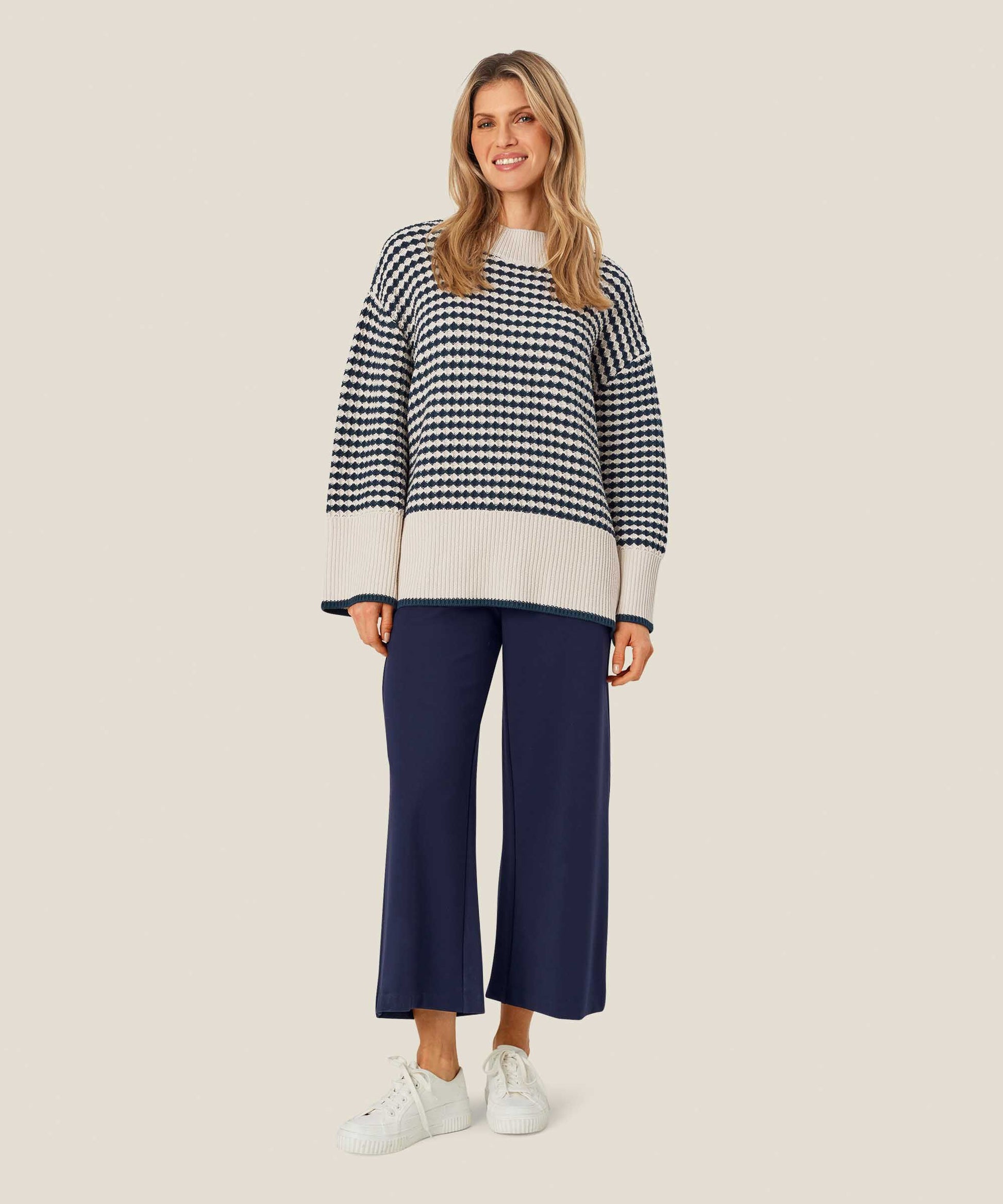 This off-white knit is love at first sight. The combination of chunky knit and dark blue details makes it perfect for an effortless transitional look. The top has a classic cut that provides generous comfort and is designed with a high neck and many delicate details. In all its simplicity, it is easy to style: Pair it with jeans, trousers or a skirt, and keep warm with style.