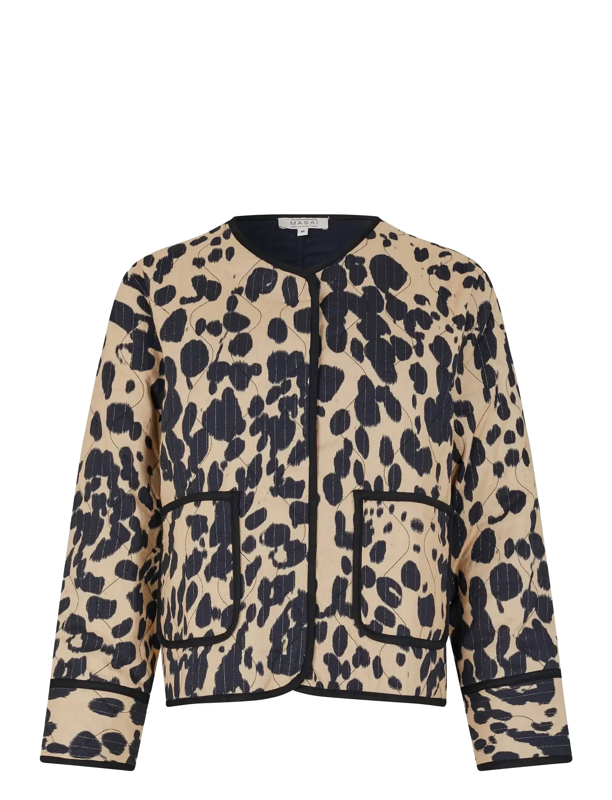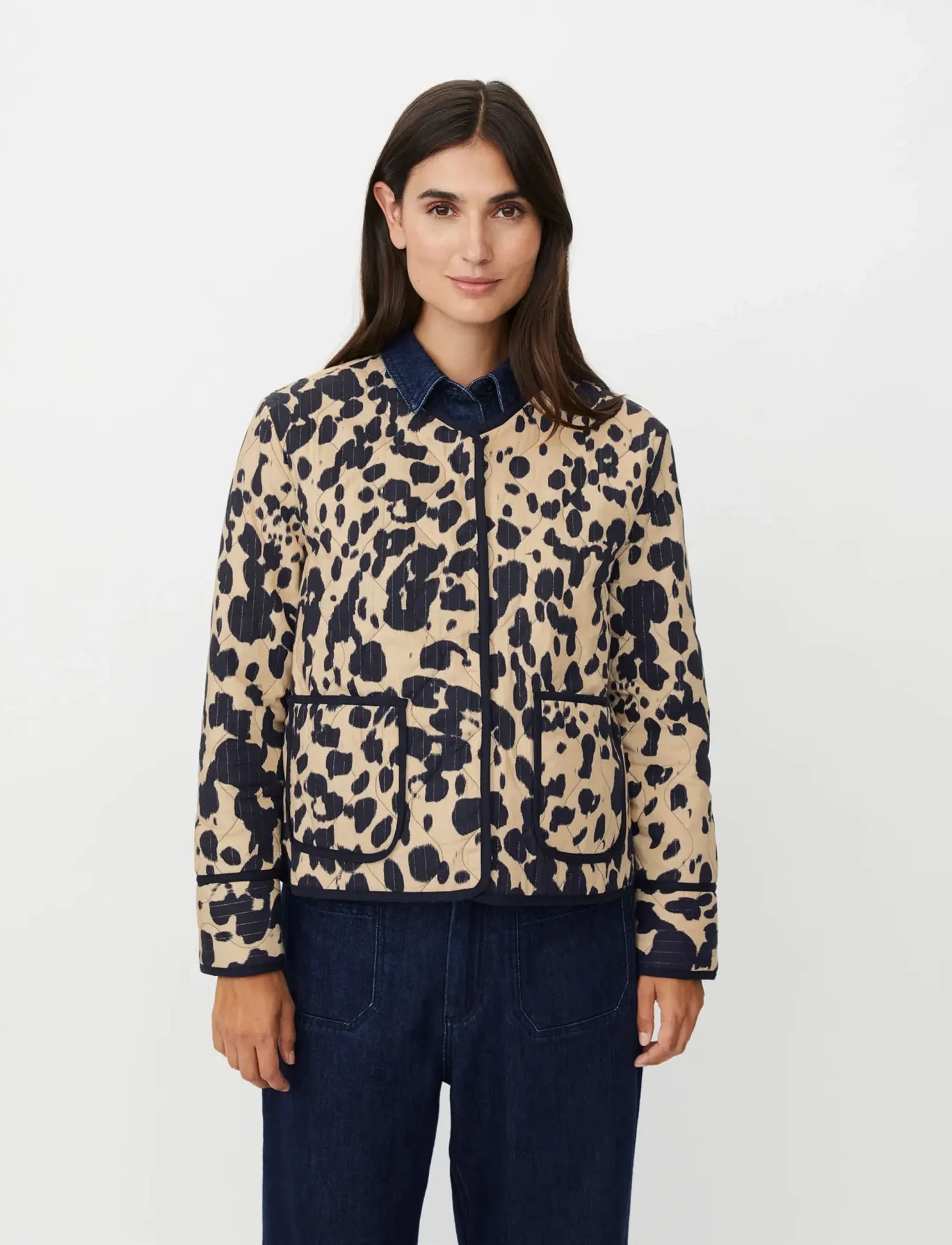 Quilted for lightweight warmth, this jacket features a striking all-over pattern. The design incorporates practical patch pockets and a clean, collarless neckline, making it a versatile layering piece.