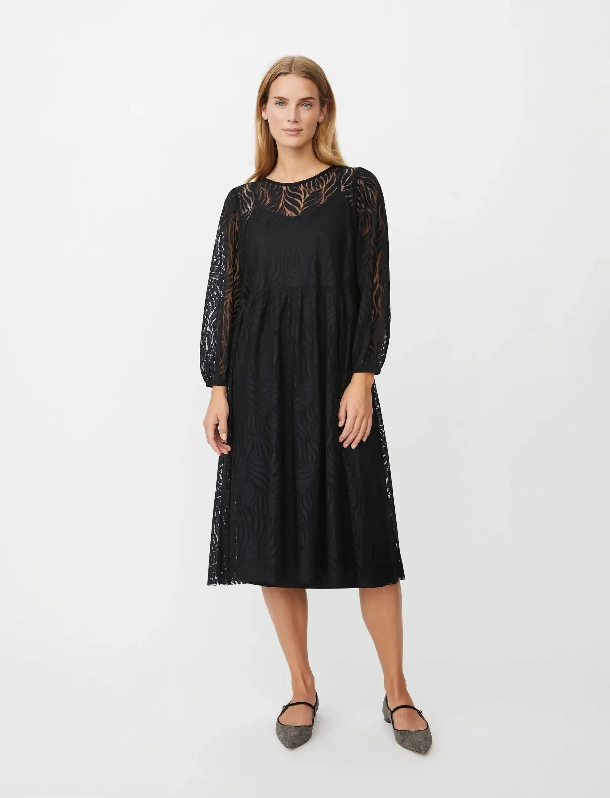Featuring a subtle pattern throughout, this dress offers a refined look. The long sleeves and midi length make it a versatile choice for various occasions.