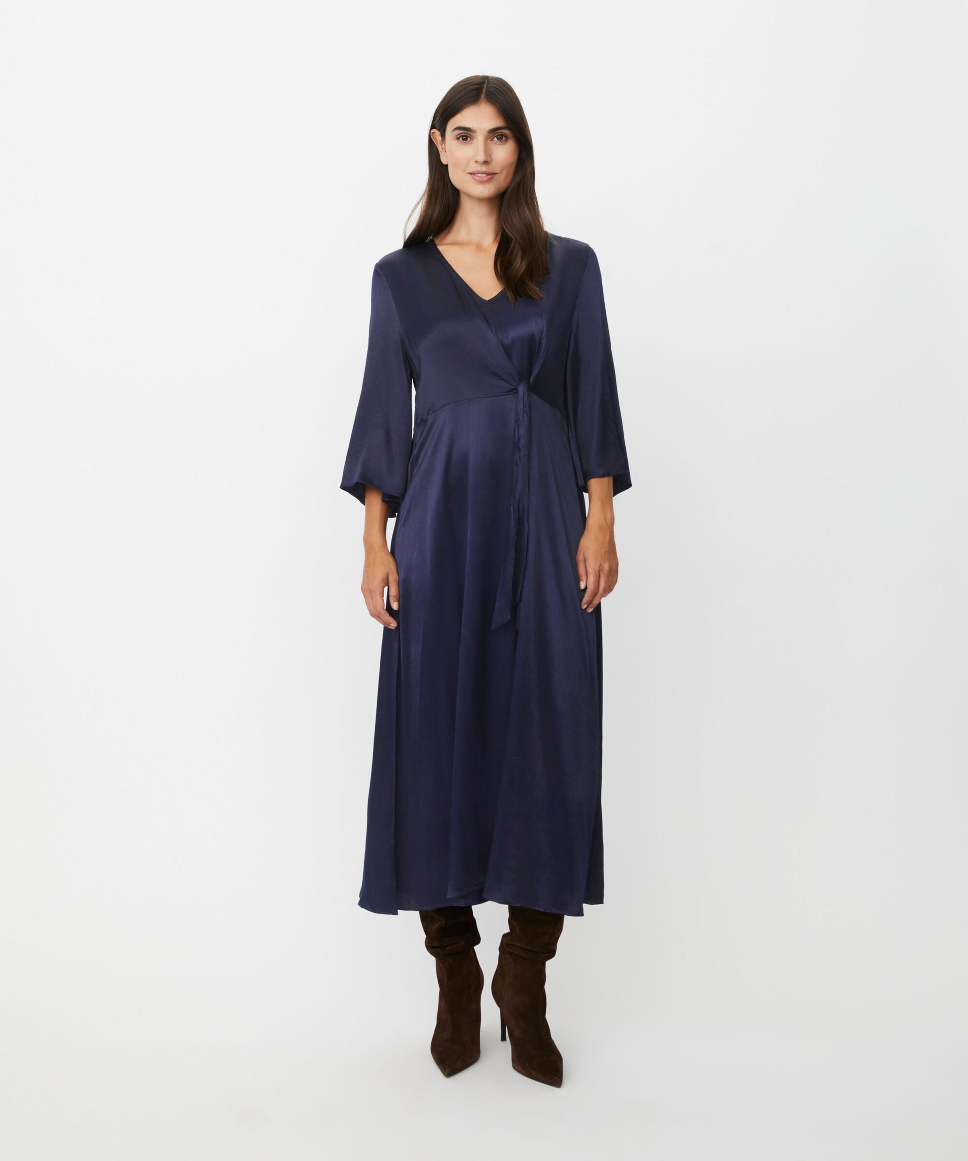 Oh la la, this dress epitomises feminine elegance. It's crafted from beautifully shiny viscose with a light texture that captures the light, offering an exclusive look. With a simple and flattering design featuring a V-neck, three-quarter length sleeves, and a tie waist, it beautifully showcases your figure. The lightly flared A-shape skirt falls elegantly over the body, offering plenty of movement. Perfect for both special occasions and elegant everyday outfits.