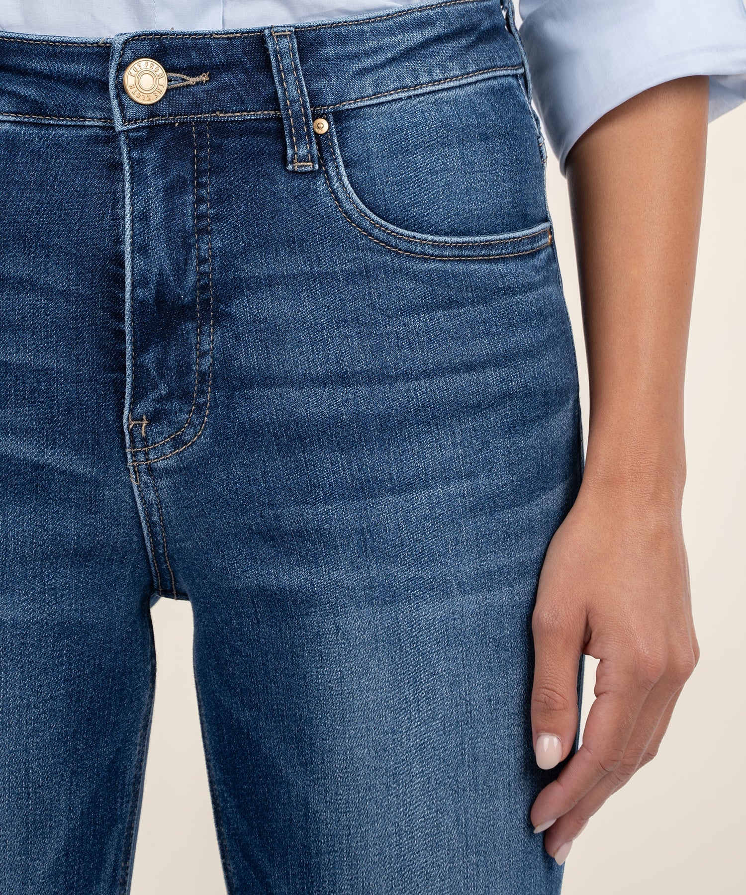 - Stretchy, slim-cut jeans with a raw hem and front pockets that comfortably shape and smooth.